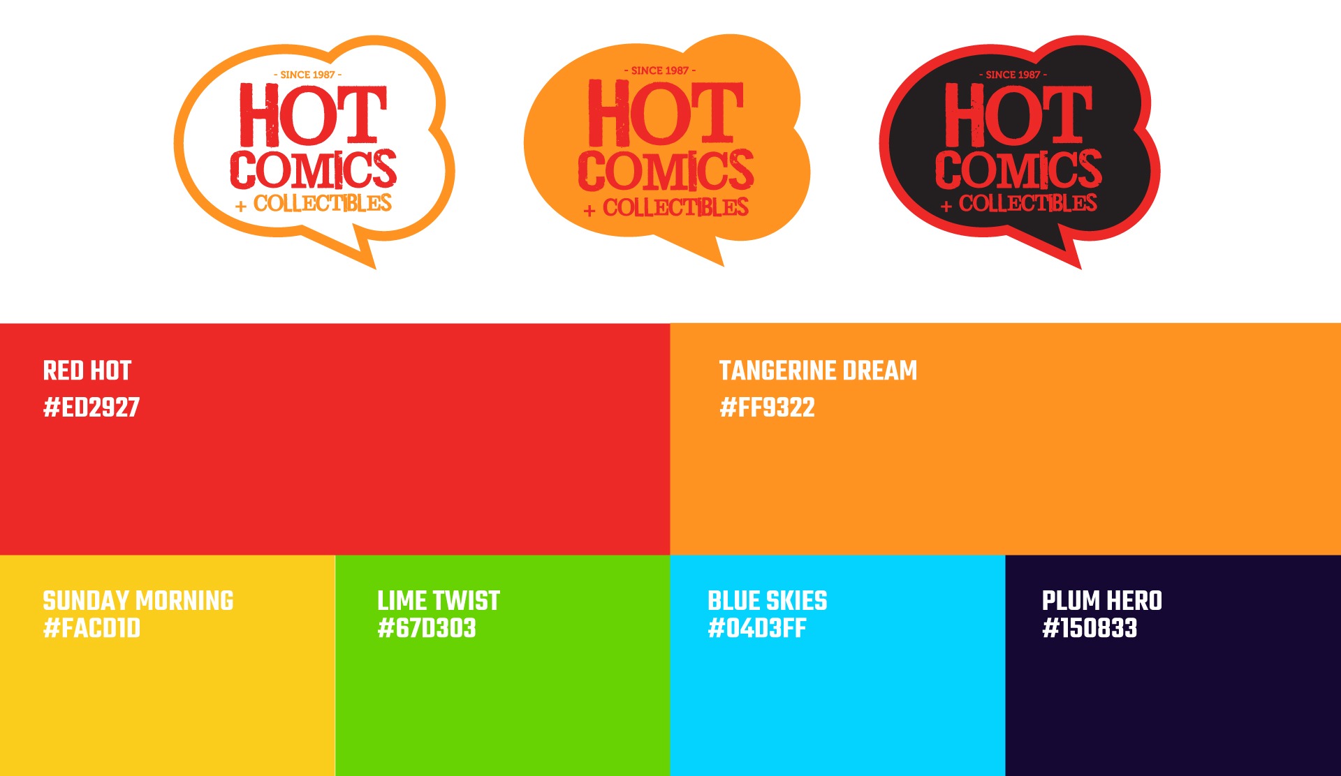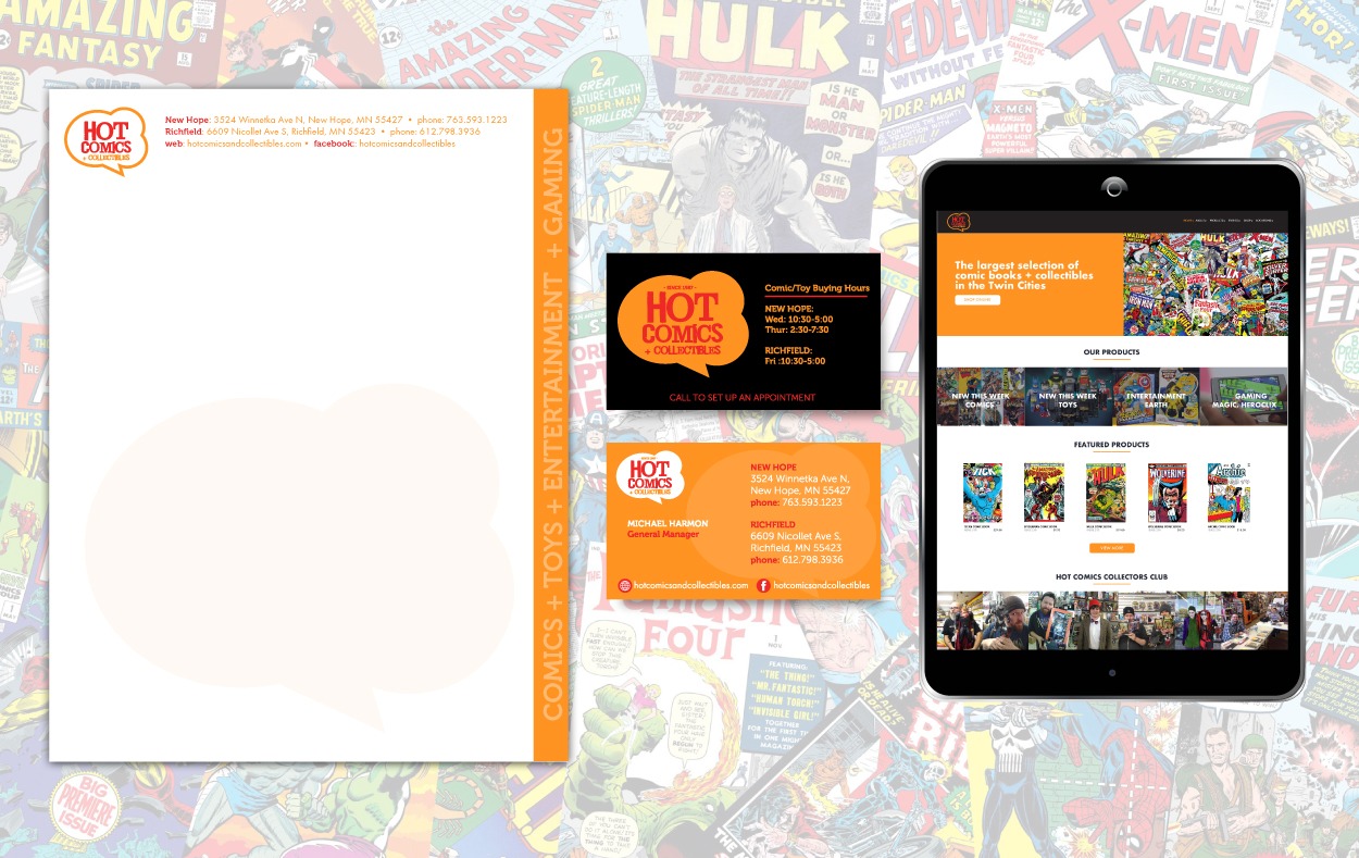 Hot Comics and Collectibles has been the Twin Cities neighborhood comic shop for over three decades. They approached me for a brand redesign. We kept the original color palette from 1987 and created a more modern, fun, comic style design that all comic book fans would love. The result is a fun, versatile design that pays homage to historic comics.